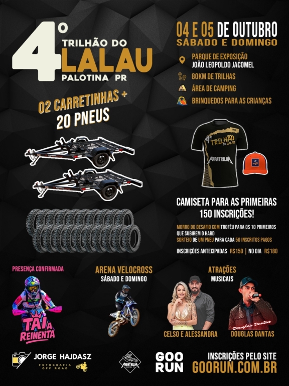 Palotina – No próximo final de semana, no sábado, dia 4 e no domingo, dia 5, estará acontecendo em Palotina, no Parque de Exposições João Leopoldo Jacomel, o 4º Trilhão do Lalau Papatrilha, com as motos rocando em alto giro com 80 km de trilha. Sábado e domingo na Arena de Velocross.