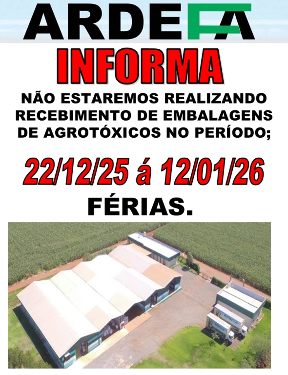 Palotina - A ARDEFA – comunica a todos os agricultores e demais interessados, que no período de 22 de dezembro 2025 a 12 de janeiro de 2026 estará em férias coletivas, para tanto, não estará realizando o recebimento de embalagens vazias de agrotóxicos.