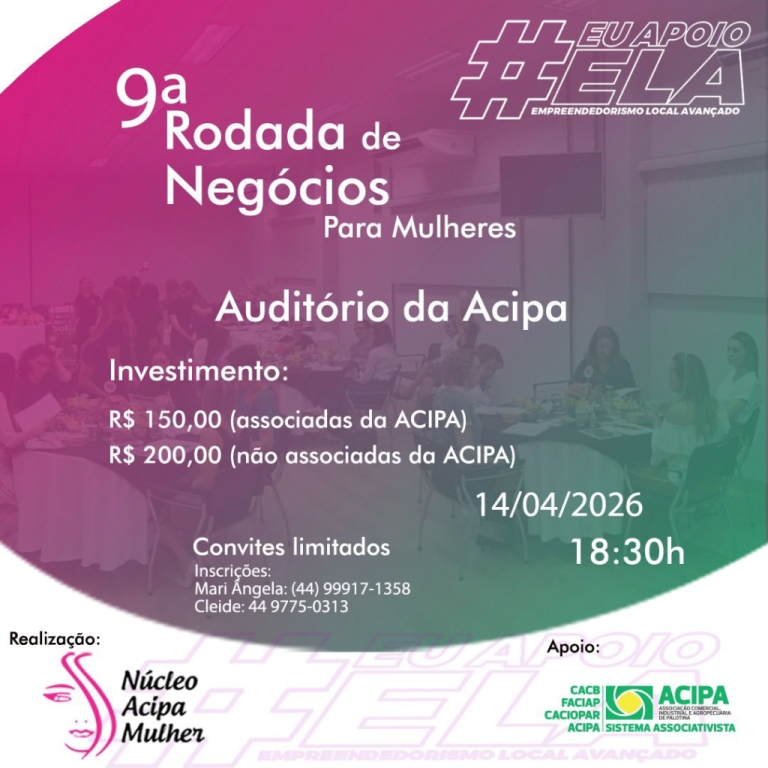 Palotina - O Núcleo Acipa Mulher, com apoio da Associação Comercial, Industrial e Agropecuária, já está preparando a 9ª edição da Rodada de Negócios para Mulheres, que acontecerá no dia 14 de abril, a partir das 18h30, no auditório da Acipa.