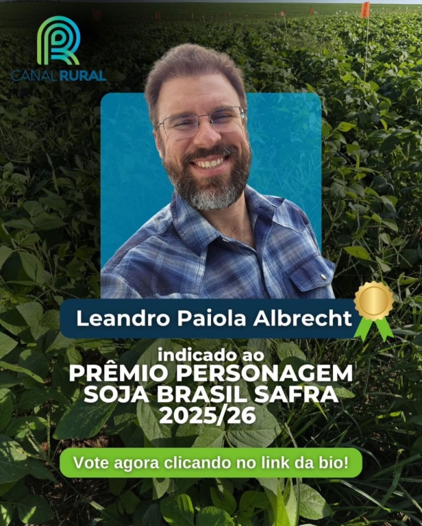 É uma grande honra ter o trabalho reconhecido ao lado de pessoas que contribuem diariamente para o desenvolvimento da agricultura, comenta o Professor Leandro. A votação é rápida e está disponível no endereço do Canal Rural https://www.canalrural.com.br/agricultura/projeto-soja-brasil/. Participe!