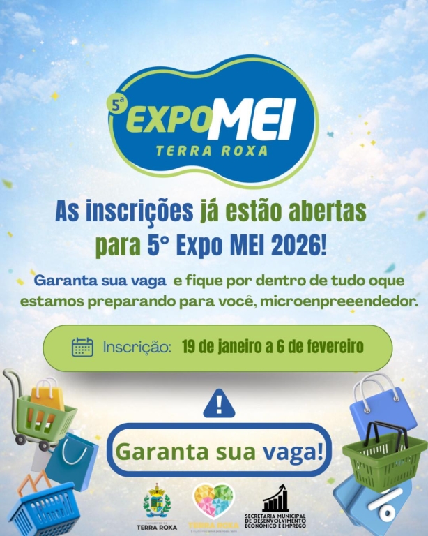 Terra Roxa – A Administração Municipal de Terra Roxa, por meio da Secretaria de Desenvolvimento Econômico e Emprego, comunica a todos interessados que as inscrições para a 5ª edição da ExpoMei estão abertas e que a data está definida e irá acontecer nos dias 10, 11 e 12 de abril.