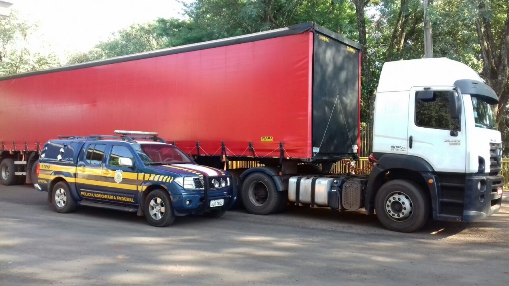 Após verificar os sinais identificadores, os policiais rodoviários federais constataram que o veículo apresentava placas falsas, tanto no caminhão como no semirreboque.
