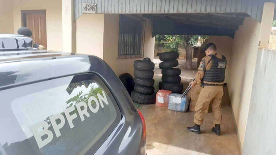 Ao olharem por uma fresta da janela, os militares constataram que a mesma servia de depósito, sendo identificados em seu interior, 03 caixas de cigarros, 02 volumes de ferramentas diversas e 41 pneus oriundos do Paraguai.