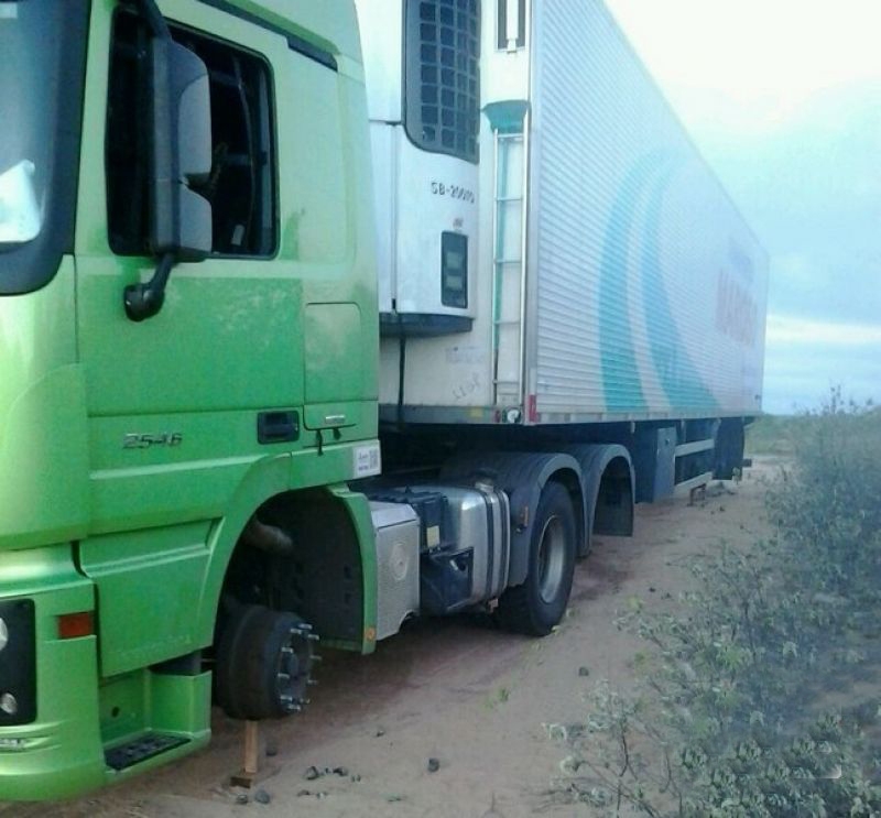 Os bandidos calçaram a carreta em tocos e levaram 18 conjuntos de pneus e rodas da carreta, e após liberaram o motorista.