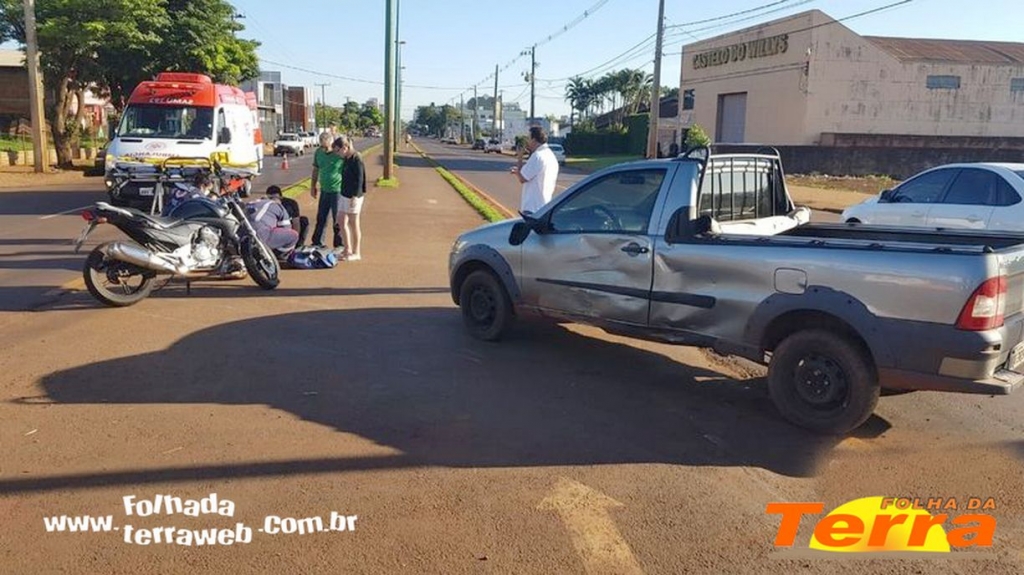 O acidente foi registrado na Avenida Presidente Kennedy, esquina com a Rua Veneza e envolveu uma Fiat Strada e uma motocicleta.