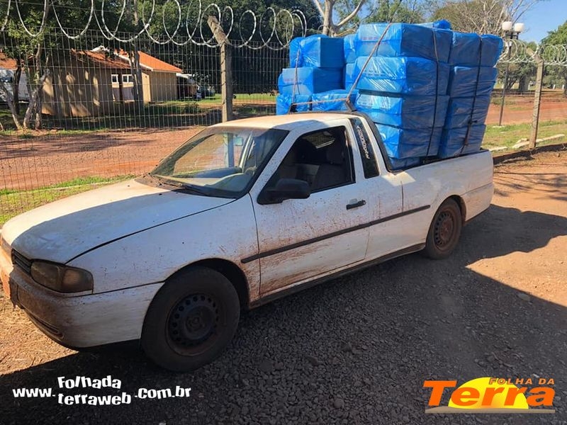 No local foi apreendido um veículo VW/Saveiro carregado com 35 caixas de cigarros paraguaios