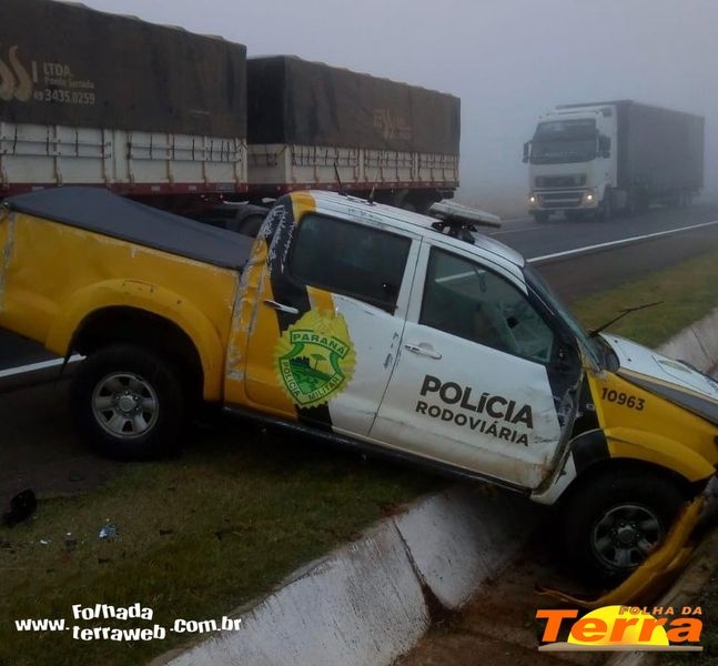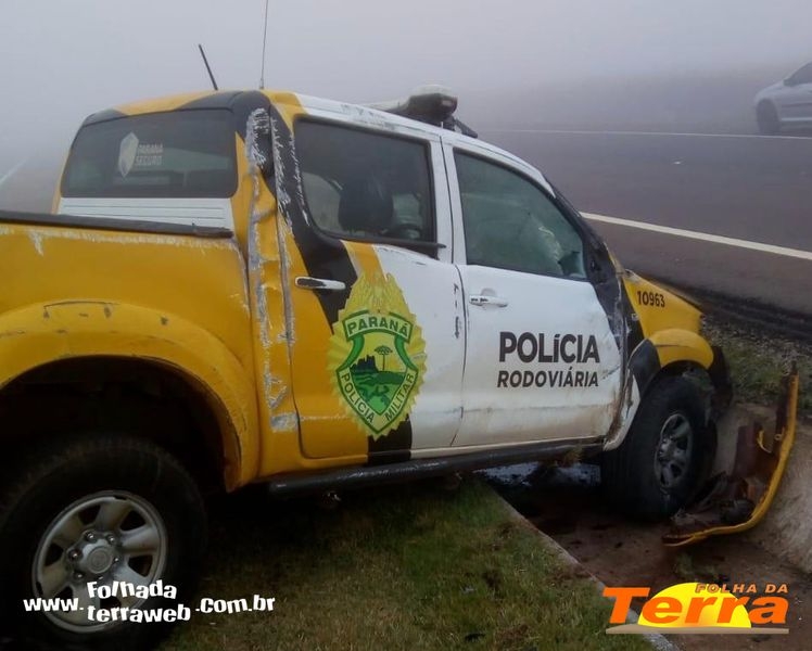 Com o impacto a viatura caiu na canaleta central da rodovia. Os carros pararam as margens da pista e ficaram totalmente destruídos.