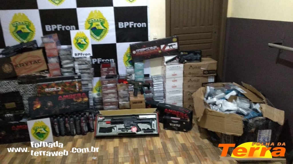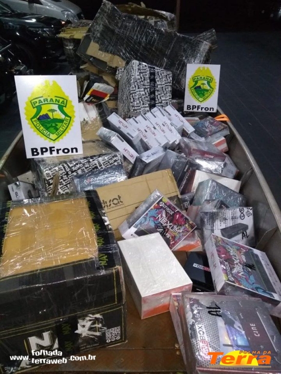 Guaíra - Na tarde de sábado, dia 11, policiais militares do BPFRON - Batalhão de Polícia de Fronteira realizavam patrulhamento em portos clandestinos no distrito de Oliveira Castro, em Guaíra, quando visualizaram indivíduos realizando o transporte de diversos objetos (volumes) às margens do rio Paraná, sendo que ao perceberem a aproximação dos policiais todos evadiram-se em meio a mata ciliar não sendo localizados. No local foram encontrados uma embarcação, veículo, essências de narguilé, armas de airsoft, além de receptores de TV e materiais de informática. Embarcação, veículo e todo material localizado foram encaminhados à Receita Federal em Guaíra-PR.