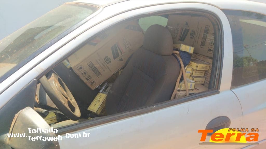Terra Roxa - Por volta das 12h, da última segunda-feira, dia 20, a equipe da Patrulha Rural da PM em patrulhamento por Terra Roxa visualizou dois veículos se aproximando, sendo que ao tentar realizar a abordagem os condutores aceleraram, seguindo cada um para uma direção. Iniciou-se acompanhamento, sendo que o condutor de um GM Celta jogou seu veículo em meio a um matagal e se evadiu. O carro estava carregado de caixas de cigarro de diversas marcas.
