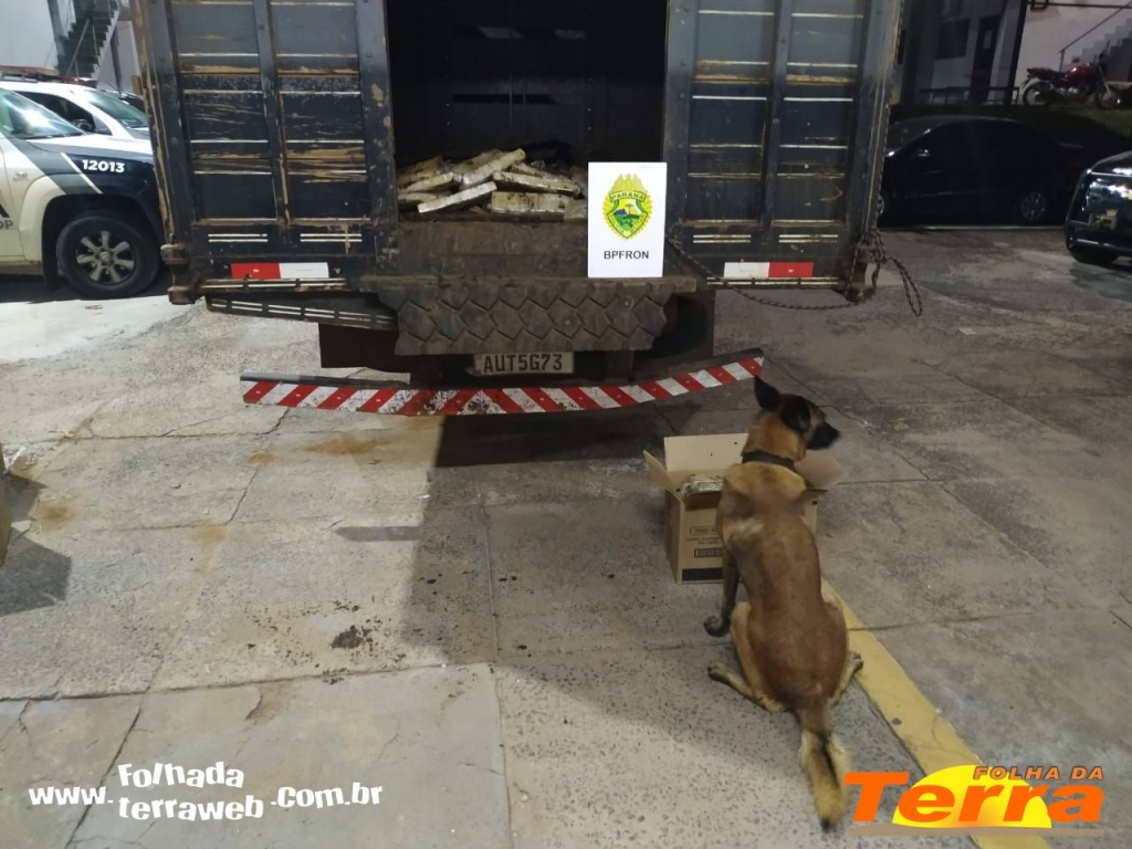 Umuarama - Sexta-feira, 29, Policiais militares do BPFron - Batalhão de Polícia de Fronteira, em mais uma ação da Operação HÓRUS quando em patrulhamento pela cidade de Umuarana, realizaram abordagem de um caminhão boiadeiro conduzido por um masculino, que durante abordagem demonstrou muito nervosismo . O que piorou quando da utilização do cão de faro Guerreiro. O cão policial indicou a presença de algo ilícito embaixo das fezes existentes na carroceria do caminhão. Após verificação pelos policiais foi constatado que embaixo das fezes continha uma grande quantidade de droga, que pesada posteriormente totalizou aproximadamente 612,5 kg de maconha. Diante do crime de tráfico de drogas, o caminhão a droga e o criminoso, foram encaminhados para as demais providências.