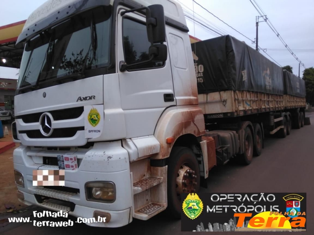 Terra Roxa - Ontem, no sábado, Policiais Militares do BPFRON - Batalhão de Polícia de Fronteira, em mais uma ação da OPERAÇÃO METRÓPOLIS, em patrulhamento pelo município de Terra Roxa, abordaram um caminhão bitrem e, em vistoria com a ajuda do cão Guerreiro, o Pel. de Op Cães localizou aproximadamente 1200 caixas de cigarros contrabandeados. O condutor abandonou o caminhão e adentrou uma mata não sendo localizado. Diante dos fatos, o veículo e os cigarros foram apreendidos e encaminhados até a Receita Federal do Brasil em Guaíra-PR.