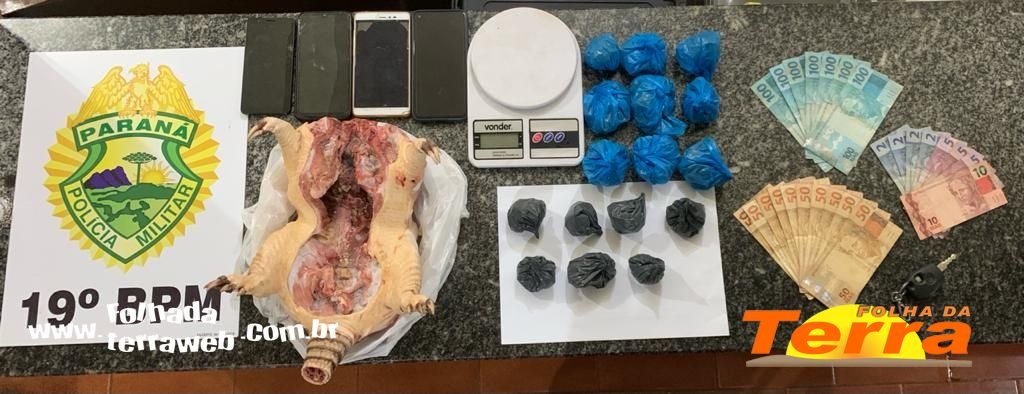 Deslocado até a casa, foi visualizado na área externa uma carcaça de tatu descongelando, animal fruto da caça ilegal. Em conversa com o responsável pela residência, foi perguntado sobre os fatos e a venda do entorpecente, este preferiu se manter calado, porém quando perguntado se havia substância entorpecente na casa, respondeu que o que as equipes achassem era de sua propriedade.