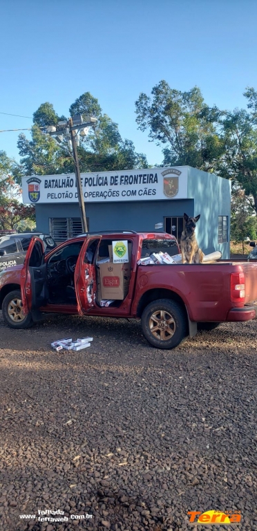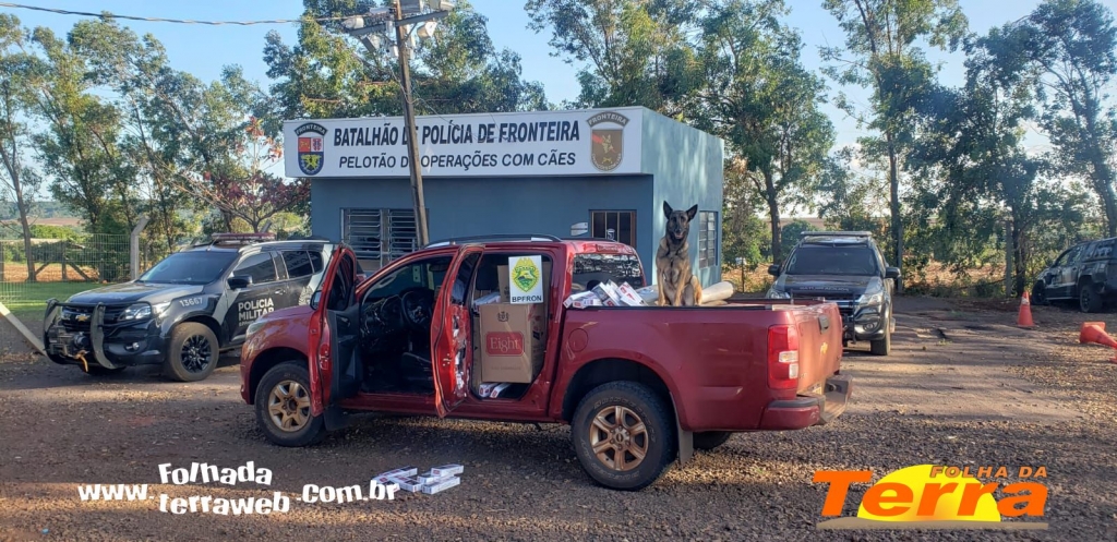 Na madrugada de quarta-feira (02/02), policiais militares do Pelotão de Operações com Cães do BPFRON - Batalhão de Polícia de Fronteira patrulhavam a cidade de Nova Santa Rosa-PR, durante Operação Hórus, quando deram ordem de parada a um veículo. O condutor não acatou a ordem e fugiu, iniciando um acompanhamento tático. O condutor abandonou o carro na contramão de uma via, fugiu a pé e não foi encontrado. O carro estava carregado com 2.500 pacotes de cigarros contrabandeados. O veículo é produto de um roubo em ocorrido em agosto de 2021 em São Bento do Sul-SC. O carro recuperado e o contrabando apreendido foram encaminhados para a Receita Federal em Guaíra-PR.