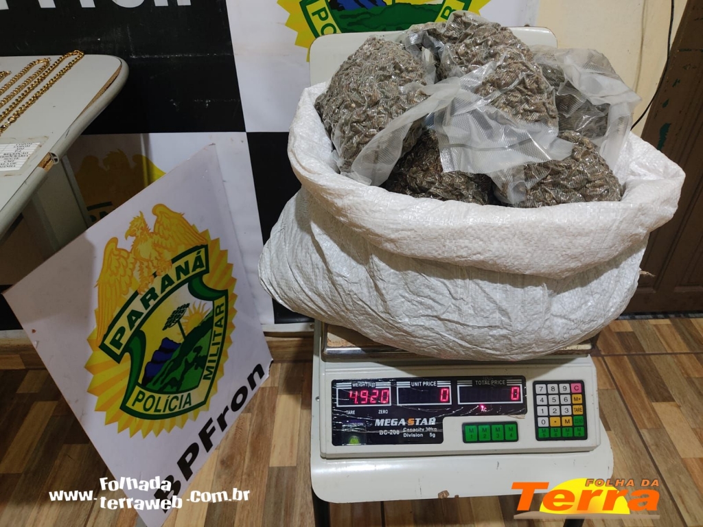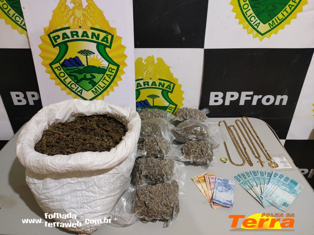 Guaíra - No domingo, (28/08), policiais militares do BPFRON - Batalhão de Polícia de Fronteira, em patrulhamento na cidade de Guaíra-PR, abordaram um ônibus de linha intermunicipal. Com um dos passageiros foi encontrado, 4,900 kg de substância análoga a maconha tipo morruga, 987,00 reais em espécie e algumas jóias de origem desconhecida. O preso de 43 anos, a droga e os itens apreendidos foram encaminhados para a Delegacia da Polícia Civil de Guaíra-PR.