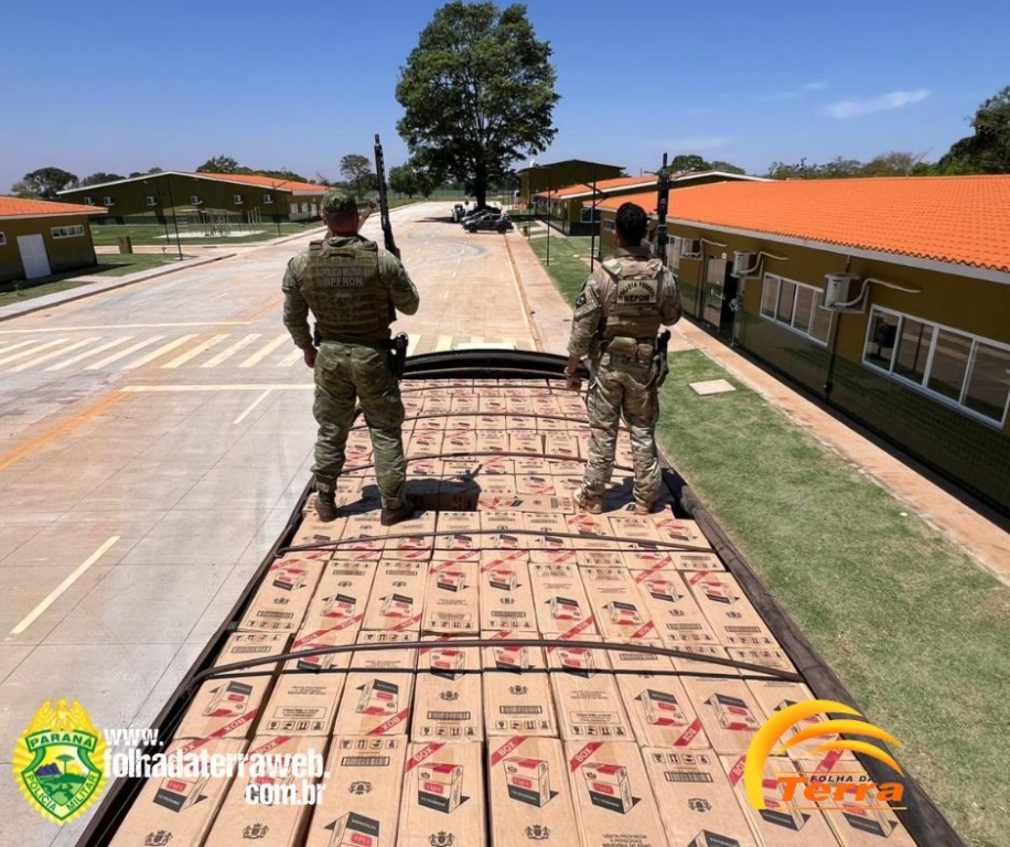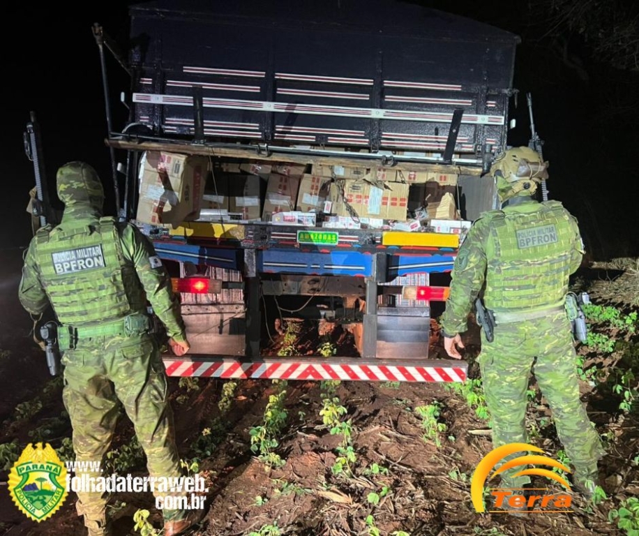 Nesta data (21/10), a Polícia Militar do Paraná, por intermédio do Batalhão de Polícia de Fronteira – BPFRON, no âmbito da Operação “Scutum Limes”, em ação conjunta com a Polícia Federal – NEPOM, realizava patrulhamento na área rural do município de Guaíra/PR, quando as equipes visualizaram marcas de veículos saindo de uma região conhecida pela presença de portos clandestinos. Durante buscas nas proximidades, foi localizado abandonado sobre uma plantação de soja um caminhão Mercedes-Benz/L 2014, carregado com 15.000 (quinze mil) pacotes de cigarros contrabandeados do Paraguai. Foram realizadas diligências na região com o objetivo de localizar os responsáveis pelo ilícito, porém sem êxito. Diante dos fatos, o veículo e a carga foram apreendidos e encaminhados à sede da 2ª Companhia do BPFRON para a confecção do Boletim de Ocorrência e, posteriormente, entregues ao NEPOM/PF para os procedimentos cabíveis.