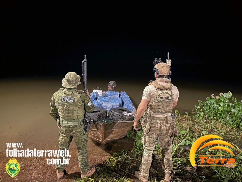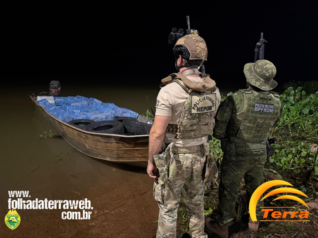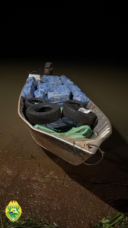 Na quinta-feira (20/11), a Polícia Militar do Paraná por meio do Batalhão de Polícia de Fronteira (BPFRON), em ação conjunta com a Polícia Federal - NEPOM, logrou êxito em localizar uma embarcação que estava carregada com 3.000 (três mil) pacotes de cigarros e 6 (seis) pneus de origem paraguaia. Foi realizado buscas na área a fim de localizar um responsável, porém sem êxito. Diante dos fatos, todo o material foi encaminhado ao pátio do NEPOM na cidade de Guaíra para os demais procedimentos legais.
